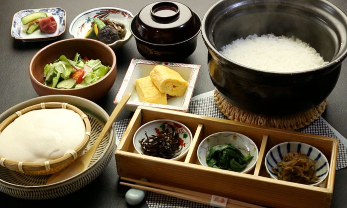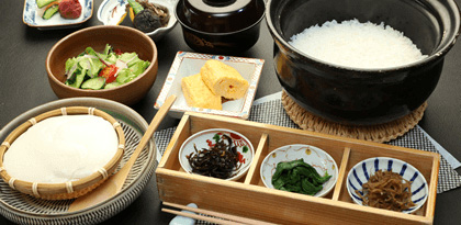 ご飯は1組様ごとに、土鍋で炊きます。たまごは、温泉たまご、たまご焼き、目玉焼きと調理方法をお選びいただけます。