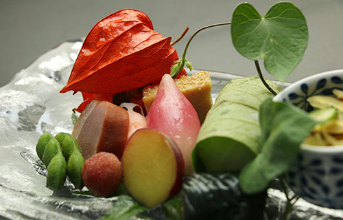 南瓜や米茄子、トウモロコシなど旬の素材を中心に使用し、器や盛り付けで涼を感じていただけるよう創意工夫した創作懐石を。